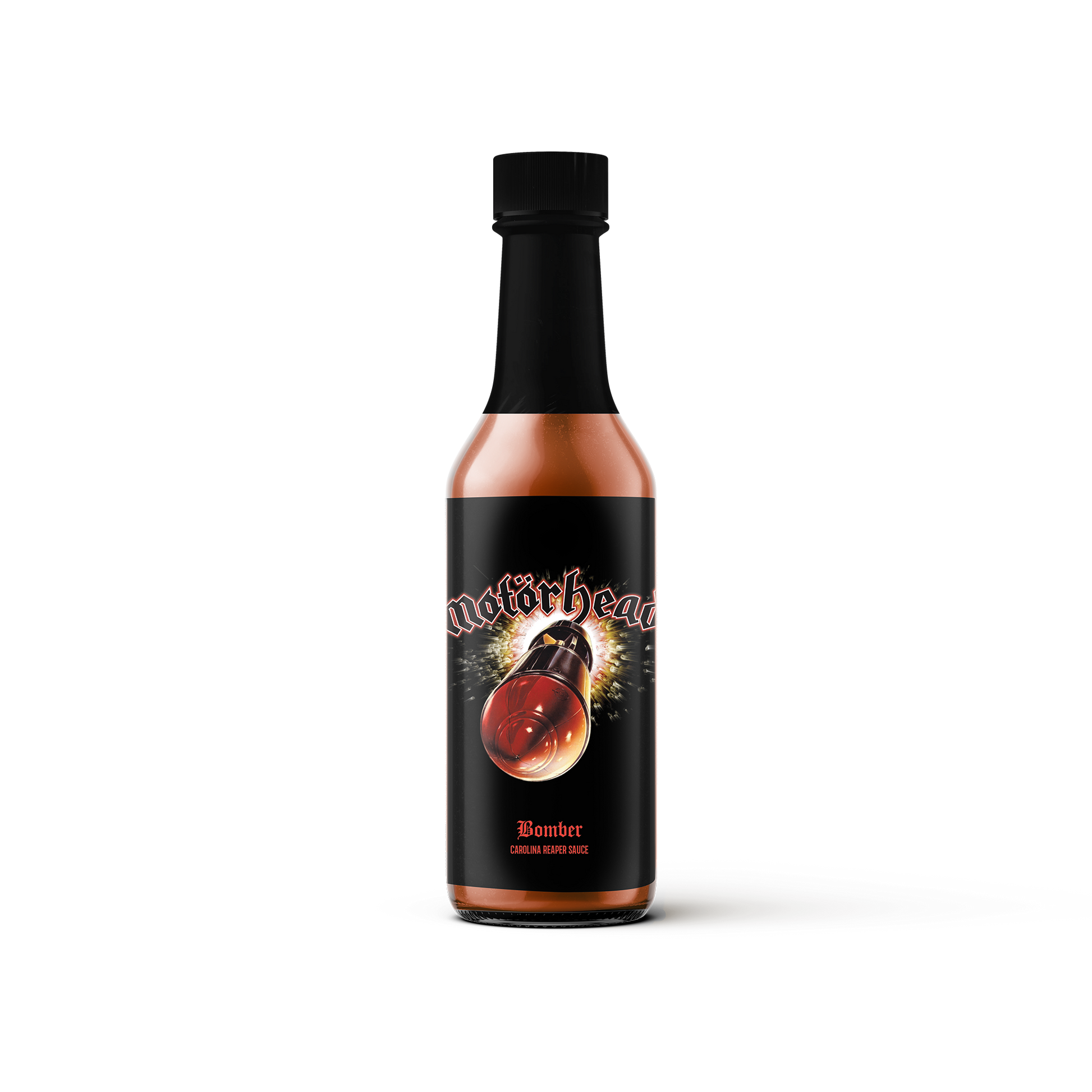 Detonate your taste buds with Bomber Carolina Reaper Sauce, a 8/10 heat assault from Motörhead’s sonic arsenal. Carolina Reaper peppers rain down apocalyptic spice with a subtle sweet sting, ideal for fearless souls bombing steaks, nachos, or soups with flavor. 5 oz bottle.